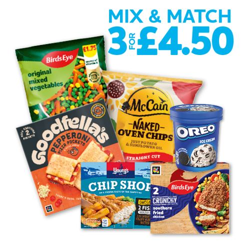 Birds Eye 12 Wholegrain Nuggets / Chicago Town Deep Dish Four Cheese / Chicago Town Deep Dish Pepperoni / Nestle Fab Lollies 6pk / Youngs 2 Chip Shop Omega 3 Battered Fish Fillets / Birds Eye Garden Peas / Mccain Lightly Spiced Potato Wedges / Oreo Bites / Birds Eye Chicken Quarter Pounders / Young's 4 Cod Fish Cakes / Nuii White Chocolate & Cranberry 3pk.