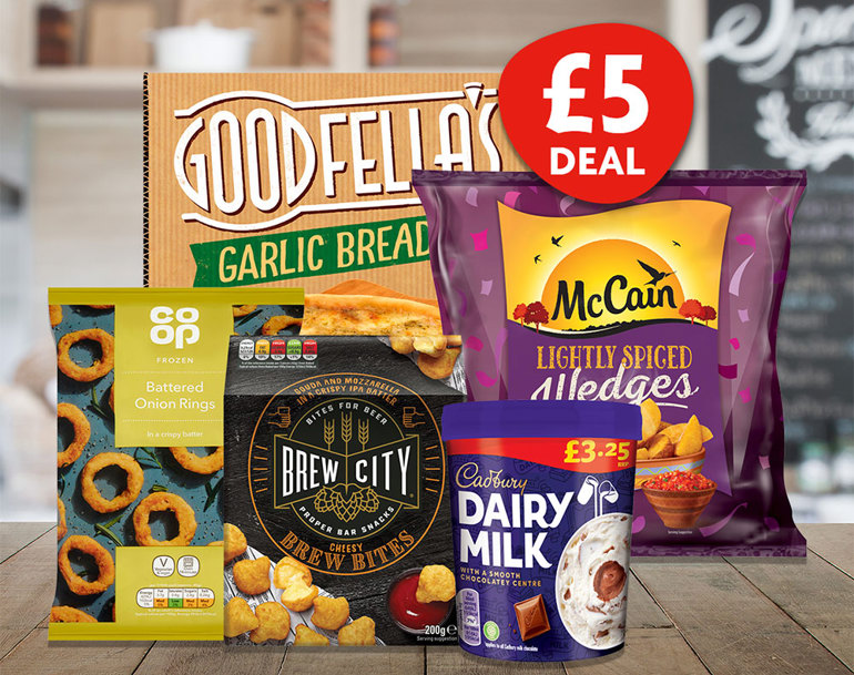 The popular £5 freezer-filling deal is also back in store, this time comprising Brewcity Cheesy Brew Bites 220g, Co-op Battered Onions Rings 454g, Goodfella’s Garlic Bread 218g, McCain Light Spiced Potato Wedges 650g and a Cadbury Dairy Milk ice-cream tub 480ml. At just £5, this deal saves shoppers £6.50 off the RRP.