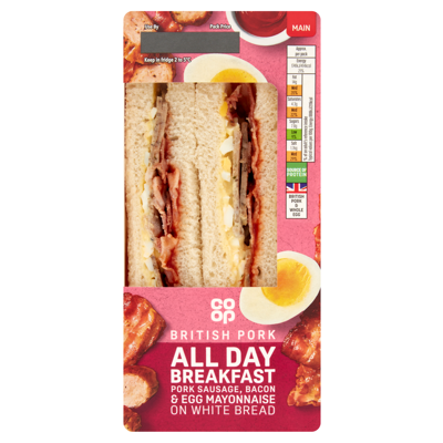 Egg mayonnaise, pork sausage and smoked bacon with tomato sauce on white bread.