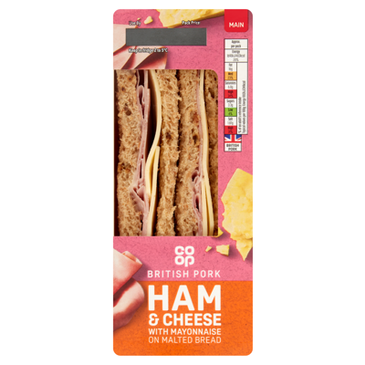 British oak smoked formed ham with added water, medium mature Cheddar cheese and mayonnaise on malted bread.