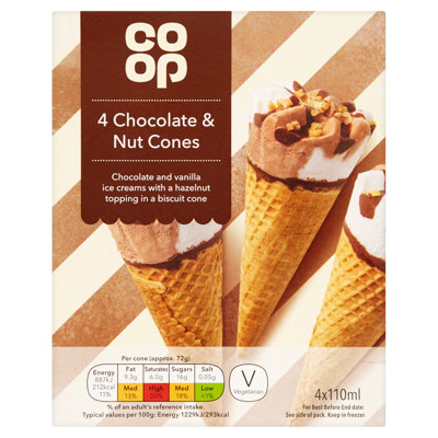 Chocolate and vanilla flavour ice creams (contains non-milk fat) with a chocolate flavour sauce and coating, topped with a sprinkle of hazelnuts in a biscuit cone