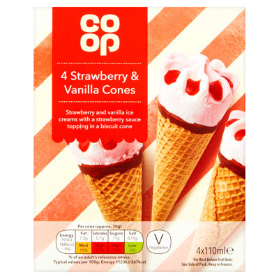 Strawberry and vanilla flavour ice creams (contains non-milk fat) with strawberry sauce and chocolate flavour coating in a biscuit cone