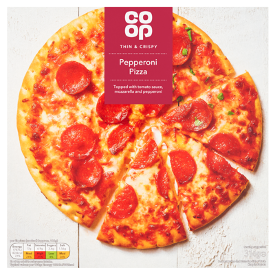 Pizza base topped with a tomato sauce, mozzarella cheese and pepperoni.