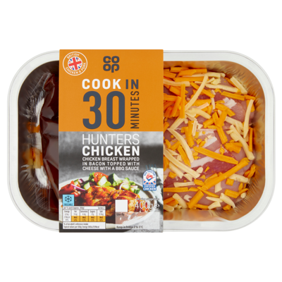 Chicken breasts covered in smoked streaky bacon with added water, topped with grated Cheddar and Red Leicester cheese and a sachet of barbecue sauce.