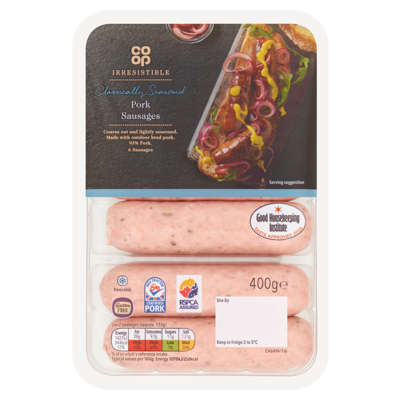 Coarse cut pork sausages lightly seasoned with spices and sage. Made with outdoor bred British pork. 93% pork.