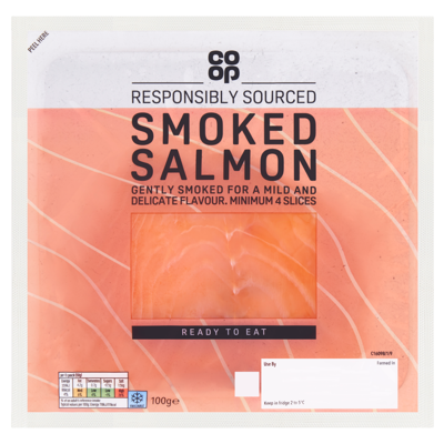Farmed salmon, dry cured and smoked over beechwood chippings, defrosted. Responsibly sourced.