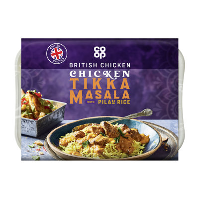 Marinated steam cooked and chargrilled British chicken breast pieces in a mildly spiced tikka sauce made with cream and cashew nut paste, served with cardamom, bay and clove spiced white rice