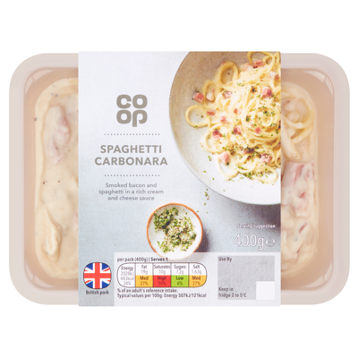 Cooked spaghetti pasta with smoked bacon in a creamy cheese sauce.