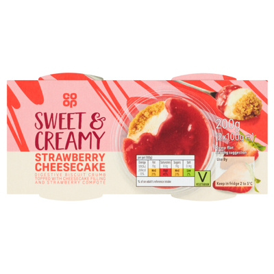 Digestive biscuit crumb with a fromage frais cheesecake layer topped with strawberry flavoured sauce x2.