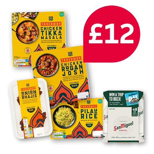 Co-0p Onion Bhajis / Co-op Takeaway Chicken Tikka / Co-op Takeaway Chicken Rogan Josh / Co-op Takeaway Korma / Co-op Takeaway Pilau Rice / Co-op Indian Bombay Potatoes / Co-op Takeaway Vegetable Masala / Co-op Takeaway Chicken Saag Masala / Co-op Saag Aloo / Co-op Lentil Dahl / Co-op Vegetable Samosas / San Miguel 4pk 5%