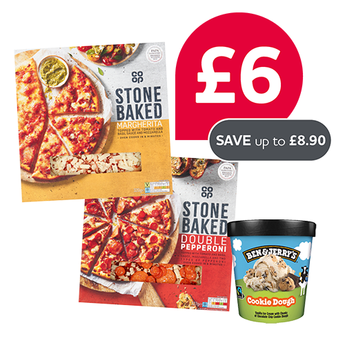 Co op stonebaked margherita / co op stonebaked pepperoni pizza / ben & jerrys cookie dough / ben & jerrys choco fudge brownie / ben & jerrys half baked / ben & jerrys phish food / ben & jerrys caramel chew chew / ben & jerrys strawberry doughnut-ee / ben & jerrys churrifically churros-y / ben & jerrys chocolatey orange / ben & jerrys sweet mango memories / ben & jerrys spectaculove / ben & jerrys dairy free bohemian raspberry