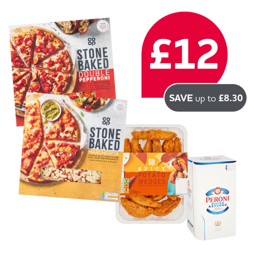 Co-op Stonebaked Pepperoni Pizza / Co-op Stonebaked Margherita / Co-op Spicy Potato Wedges / Co-op British Chicken Poppers / Co-op 12 Garlic Doughballs / Peroni Nastro Azzuro 5%.