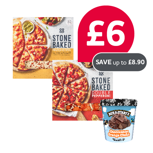 Co-op Stonebaked Margherita / Co-op Stonebaked Pepperoni Pizza / Ben & Jerry's Cookie Dough / Ben & Jerry's Choco Fudge Brownie / Ben & Jerry's Half Baked / Ben & Jerry's Phish Food / Ben & Jerry's Choc Orange / Ben & Jerry's Caramel Chew Chew / Ben & Jerry's Sweet Mango Memories / Ben & Jerry's Dairy Free Bohemian Raspberry / Ben & Jerry's Spectaculove