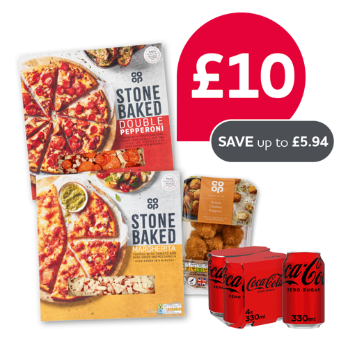 Co-op Stone Baked Margherita / Co-op Stone Baked Pepperoni Pizza / Co-op Irresistible Extra Virgin Olive Oil Roast Garlic & Parsley Flatbread / Co-op 12 Garlic Doughballs / Co-op Spicy Potato Wedges / Co-op British Chicken Poppers / Co-op 2 Garlic Batons / Coke Zero 4pk / Coke Diet 4pk
