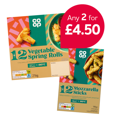 Co-op Tempura Prawns / Co-op Veg Spring Roll / Co-op Hash Brown Stars / Co-op Cheese Mini Pizza 9pk / Co-op Halloumi Fries / Co-op Mini Hash browns / Co-op Mozzarella Sticks