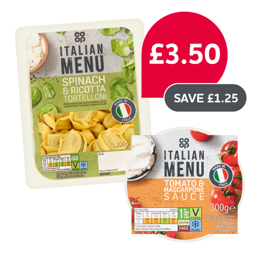Co-op Spinach & Ricotta Tortelloni / Co-op Chicken & Pancetta Tortelloni / Co-op Cheese & Tomato Tortelloni / Co-op Cheese & Chorizo Tortelloni / Co-op Tomato & Mascarpone Pasta Sauce / Co-op Arrabiata Pasta Sauce / Co-op Fresh Tomato & Basil Pasta Sauce / Co-op Carbonara Pasta Sauce