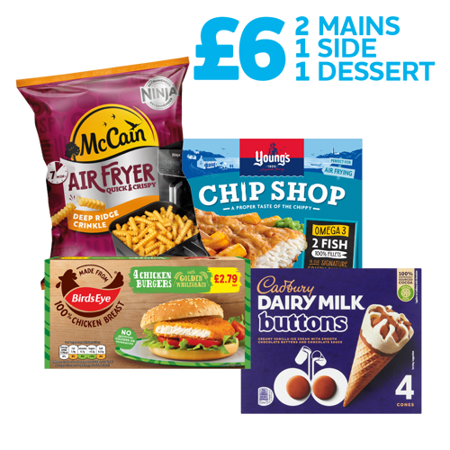 Youngs 2 Chip Shop Omega 3 Battered Fish Fillets / Young's 4 Cod Fish Cakes PM£1.59 / Bird's Eye 4 Chicken Burger £2.79 / Bird's Eye 12 Wholegrain Nuggets / Bird's Eye Mixed Veg PM£1.75 / McCain Air Fryer Ridge Crinkle Chips / McCain Air Fryer French Fries / Oreo Bites / Cadbury Buttons Cone 4pk / Cadbury Crunchie Cones 4pk.