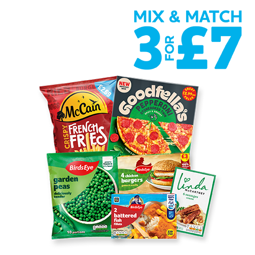 Birds eye 6 chunky fish fingers / Birds eye 2 fish fillets in batter/ Goodfellas thin pepperoni pizza pm£2.99 / Goodfellas thin cheese £2.99/ goodfella's garlic pizza bread/ birds eye 10 potato waffles £2.50/ birds eye 2 crispy chicken pm£3.00/ birds eye 2 southern fried chicken / birds eye chicken quarter pounders 2pk / birds eye 4 chicken burger £3.00 / birds eye 12 chicken dippers pm£3.00 / birds eye garlic & herb kiev pm£2.99 / birds eye 12 wholegrain nuggets / birds eye garden peas / birds eye petit pois pm£2.59 / goodfellas creamy carbonara & chorizo / goodfellas beef lasagne / goodfellas meat feast pasta bake / crosta & mollica roast garlic & mozzarella flatbread / rowntrees fruit blaster 6pk / nestle rowntree watermelon lollies 4pk / del monte orange lollies 3pk / rowntrees mango lollies 4pk / co op irresistible chunky maris piper chips / co op irresistible beef dripping roast potatoes / co op hash brown stars / linda mccartney 6 vegetarian sausages / linda mccartney mozzarella burgers / linda mccartney rosemary & red onion sausages / mccain crispy french fries pm£2.69 / mccain home chips straight pm£2.69 / mccain / home chips straight / mccain hash brown pm£2.69 / mccain home chips crinkle cut / mccain lightly spiced potato wedges / mccain potato smiles gluten free / mccain gastro chips pm£2.99 / richmond 8 thick pork sausages pm£2.39 / richmond meat free sausages / richmond 12 thick sausages / quorn cheese & broccoli escalope 2pk / young's admiral's pie pm£2.75 / young's mariner's pie pm£2.75 / youngs 2 chip shop omega 3 battered fish fillets / co op halloumi fries / co op mini hash browns/ co op mozzarella sticks
