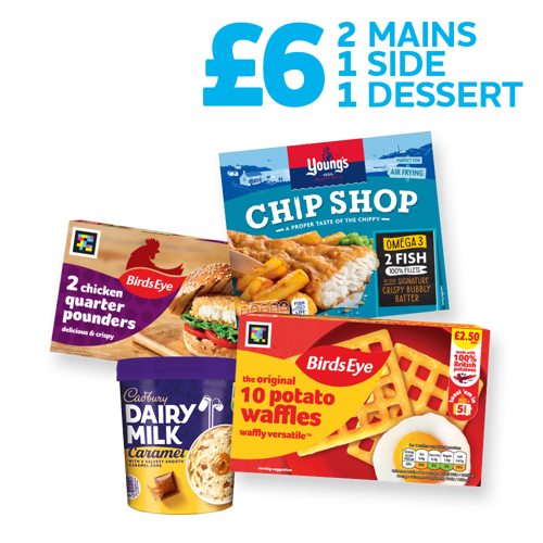 Birds Eye Veggie Fingers 10pk / Youngs 2 Chip Shop Omega 3 Battered Fish Fillets / Youngs 4 Cod Fish Cakes PM£1.59 / Birds Eye Chicken Quarter Pounders 2pk/ Birds Eye 10 Potato Waffles £2.50/ Birds Eye Mixed Veg Pm£1.75 / McCain Lightly Spiced Potato Wedges / Cadbury Caramel Ice Cream Tub / Cadbury Dairy Milk Ice Cream Tub / Cadbury Crunchie Ice Cream Tub