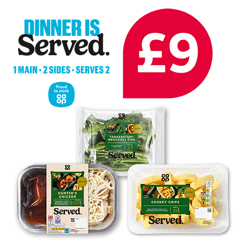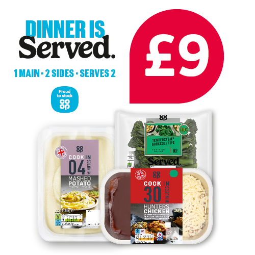 Co-op slow cook beef & red wine / Co-op chicken casserole / Co-op British hunters chicken / Co-op hog roast joint/ Co-op smoked haddock gratin / Co-op served cheese & onion pie / Co-op mashed potato/ Co-op root veg mash / Co-op roast potatoes / Co-op crispy potato slices / Co-op chunky chips / Co-op green vegetable medley / Co-op winter roasting tray / Co-op cauliflower cheese/ Co-op fairtrade tender stem broccoli / Co-op carrot broccoli & cauliflower / Co-op 2pk jumbo Yorkshire puddings 190g