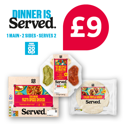 Co-op fish goujons sweet chilli & lime / Co-op slow cook Mexican chicken / Co-op loaded Mexican chicken rtc/ Co-op Mexican pulled pork / Co-op chunky beef chill / Co-op Mexican bean chilli 500g / Co-op taco shells/ Co-op mini corn tortillas 8pk / Co-op plain tortilla 6pk / Co-op Mexican spicy rice 300g / Co-op sweet potato fries / Co-op spicy wedges / Co-op corn cobettes garlic & chilli/ Co-op fajita vegetables / Co-op Mexican fiesta salad / Co-op tex mex multipack / Co-op served taste of Mexico chicken fajita empanada