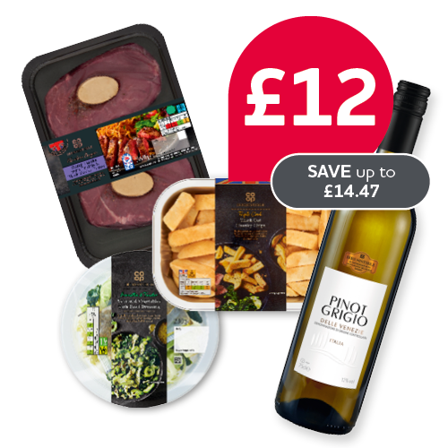 Co-op irresistible valentines chicken parmigiana / Co-op irresistible valentines chicken with truffle & wine sauce / Co-op irresistible beef bourguignon / Co-op irresistible salmon en croute / Co-op irresistible British angus rump steak in truffle garlic butter / Co-op irresistible aubergine parmigiana / Co-op irresistible chicken & mushroom pie / Co-op irresistible macaroni cheese / Co-op irresistible lasagne al forno / Co-op irresistible mashed potato / Co-op irresistible triple cooked thick cut chunky chips / Co-op irresistible dauphinoise potatoes / Co-op irresistible veg medley basil 230g / Co-op irresistible kale salad bowl / Co-op irresistible extra virgin olive oil roast garlic & parsley flatbread / Co-op irresistible solo pale spanish rose 13.5 % / Co-op irresistible pinot grigio 12% / Co-op irresistible rioja crianza 13.5%