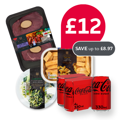 Co-op irresistible valentines chicken parmigiana / Co-op irresistible valentines chicken with truffle & wine sauce / Co-op irresistible beef bourguignon / Co-op irresistible salmon en croute / Co-op irresistible British angus rump steak in truffle garlic butter / Co-op irresistible aubergine parmigiana / Co-op irresistible chicken & mushroom pie / Co-op irresistible macaroni cheese / Co-op irresistible lasagne al forno / Co-op irresistible mashed potato / Co-op irresistible triple cooked thick cut chunky chips / Co-op irresistible dauphinoise potatoes / Co-op irresistible veg medley basil 230g / Co-op irresistible kale salad bowl / Co-op irresistible extra virgin olive oil roast garlic & parsley flatbread / Coke Diet 4pk / Coke Zero 4pk / Co-op Irresistible Elderflower Presse / Co-op Irresistible Lime & Mint Presse